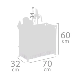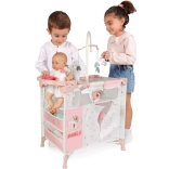Il set include tutto per una cura completa: culla con finestra trasparente in rete, giostrina con foglioline, fasciatoio, seggiolone con set in plastica (biberon, ciotola, posate) e grande guardaroba con zip con asta e 3 appendini. Grazie alla struttura salvaspazio, l’intero complesso è facile da maneggiare e, dopo il gioco, si riordina rapidamente.