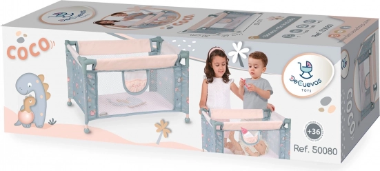 Il lettino da viaggio per bambole della collezione COCO, leggero e salvaspazio, conquista con l’allegro motivo di dinosauri e dettagli pratici per il gioco quotidiano. Offre una struttura robusta, fianchi in rete per il controllo e una tasca laterale per gli accessori. Si ripiega facilmente in un formato compatto ed è pronto per gite e spostamenti in casa.