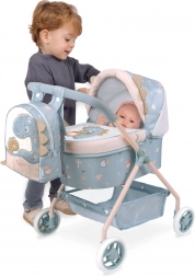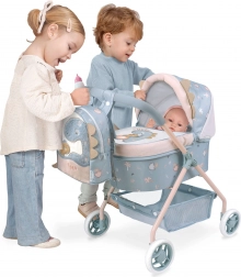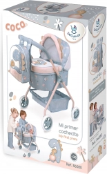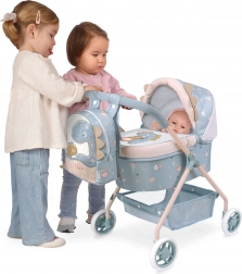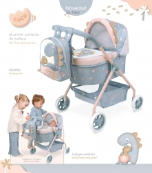 Adorabile passeggino per bambole della collezione COCO con zainetto, perfetto per i piccoli che amano prendersi cura. Offre una struttura stabile, facile maneggevolezza e accessori pratici, tra cui cestino portaoggetti e materassino. I colori delicati con il motivo della mamma dinosauro e del cucciolo favoriscono il gioco creativo e di imitazione.