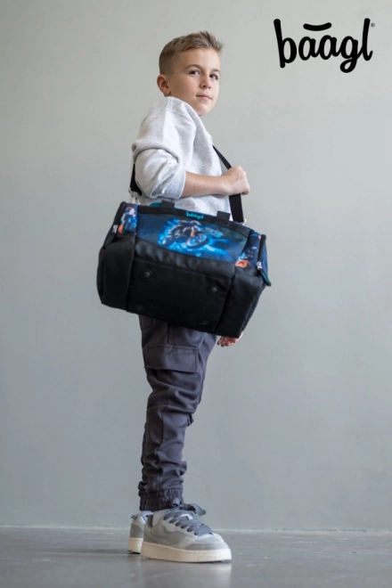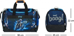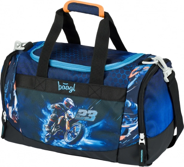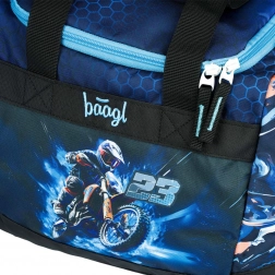 Leggera e pratica borsa sportiva per bambini BAAGL con motivo moto, ideale per corsi, allenamenti e come bagaglio a mano. Offre una capiente scomparto principale con ampio coperchio per un facile confezionamento, tasca separata per le scarpe, tracolla rimovibile e regolabile per il trasporto a spalla e fondo rinforzato impermeabile. La scorrevolezza è garantita da affidabili cerniere YKK e gli elementi riflettenti aumentano la sicurezza dei bambini al crepuscolo.