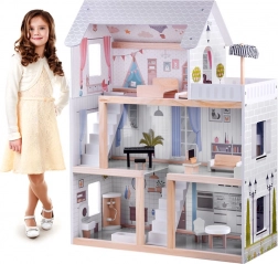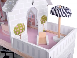 La casetta è dotata di una striscia LED per una piacevole luce ambientale in ogni stanza. La struttura aperta, le finestre e la facciata decorata con fiori e lampioni conferiscono un aspetto realistico. La confezione include un'ampia gamma di mobili in legno: dal tavolo da pranzo, poltroncine e divano, all'arredo del bagno, fino al pianoforte nero con sgabello e al lettino con ombrellone per la terrazza.