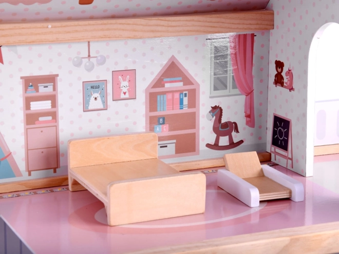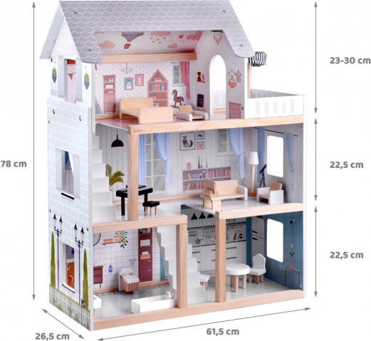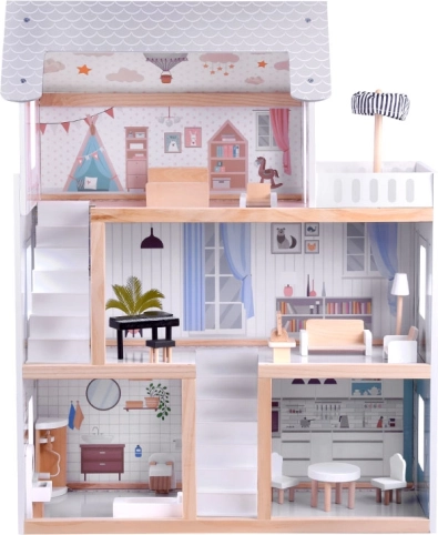 Questa casa delle bambole in legno è progettata per ispirare i bambini al gioco creativo e alla narrazione. Offre un piano terra con cucina e bagno, un primo piano con soggiorno e angolo lettura con spazio per gli amanti della musica, e una mansarda con una graziosa cameretta e un'ampia terrazza. La delicata estetica boho, le illustrazioni e gli elementi in legno hanno un effetto rilassante.