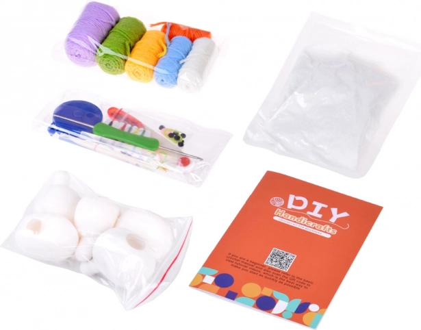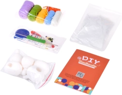 - 6× gomitolo (ecrù, blu, giallo, verde, viola, arancione); 5× palloncino in gomma per imbottitura; imbottitura (ovatta); uncinetto 2,5 mm; forbici di sicurezza; 2× ago di sicurezza; occhietti autoadesivi; 10× spilla da balia/marcatore; metro a nastro; colla a caldo in stick; istruzioni illustrate (EN)