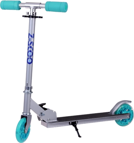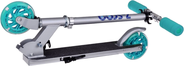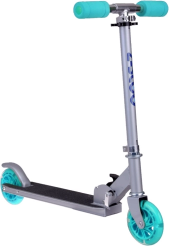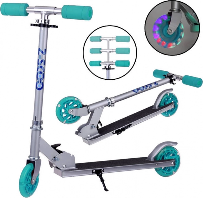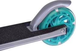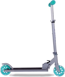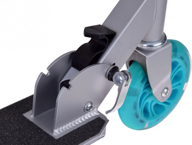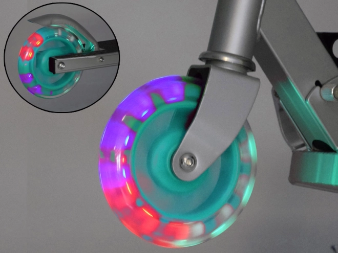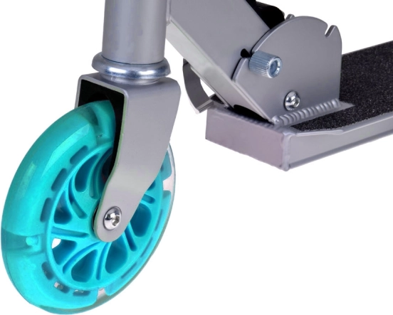 Questo monopattino pieghevole per bambini unisce leggerezza, solida struttura metallica e un design giocoso con dettagli turchesi. Grazie alle ruote LED che si illuminano durante la marcia e non richiedono batterie, il bambino è più visibile e ogni uscita è ancora più divertente.