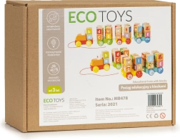 Il treno in legno con corda, pieno di blocchi colorati è progettato per scopi educativi. Aiuta i bambini ad apprendere lettere e colori e a sviluppare la loro creatività.
