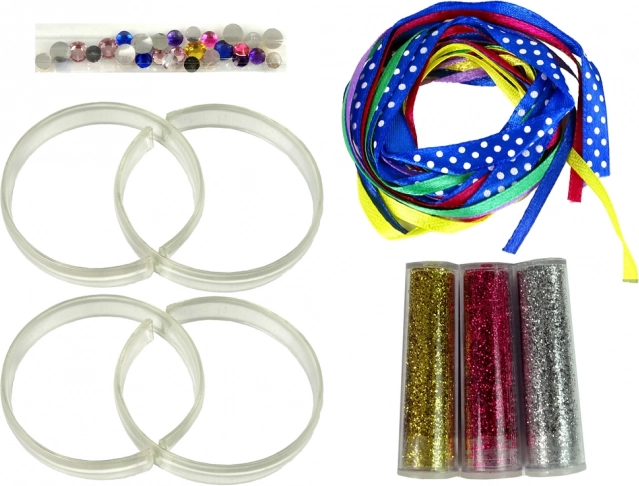 Contenuto della confezione: 4 braccialetti trasparenti, 3 glitter (oro, argento, rosa) e nastri in vari colori. Il set è riposto in una scatola decorativa, perfetto come regalo. Consigliato per bambini dagli 8 anni in su. Contiene piccole parti.