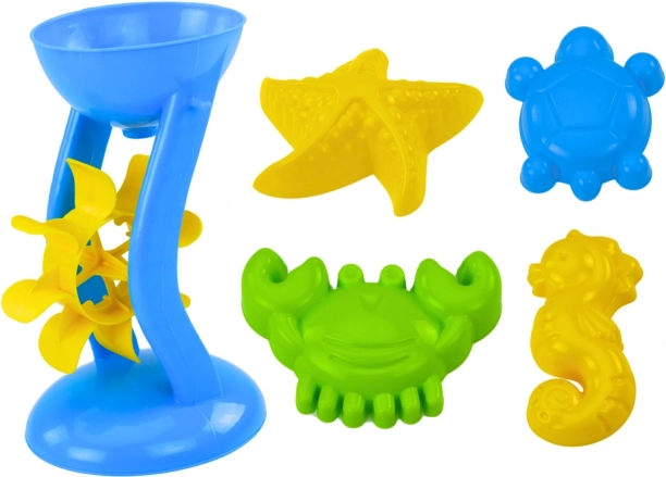 Il set comprende anche un mulino che può essere utilizzato per versare sabbia o acqua. Con l'aiuto della paletta e del rastrello, i piccoli costruttori possono creare castelli e tunnel o cercare tesori nascosti. Quattro formine marine a forma di cavalluccio, stella marina, granchio e tartaruga aggiungono creatività e divertimento.