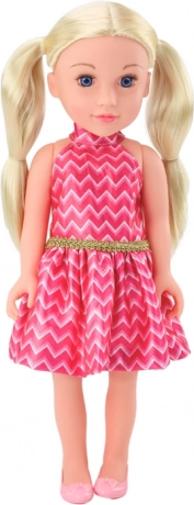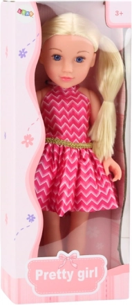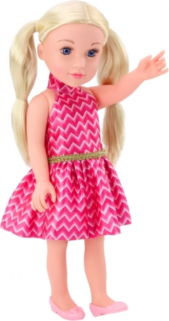 Questo bellissimo burattino ha lunghi capelli biondi acconciati in codini, aggiungendo fascino infantile. I capelli sono morbidi e facilmente modellabili, permettendo giochi di hairstyling creativi. Il burattino ha trucco delicato e ciglia lunghe, che enfatizzano i suoi tratti facciali distintivi. È vestito con un abito rosa a cintura d'oro, completato da scarpe rosa.