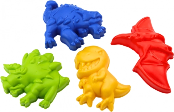 Quattro formine colorate a forma di dinosauro stimolano la fantasia e trasformano ogni paesaggio di sabbia in un'avventura preistorica.