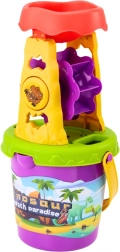 Tutto il necessario in un unico set: secchiello con mulino, setaccio e imbuto, paletta, rastrello, annaffiatoio e due formine per un divertimento senza fine in spiaggia e nella sabbiera.