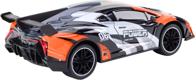 Carrozzeria sportiva grigio‑arancione con elementi da corsa, scritte e alettone posteriore che donano al modello un look realistico.