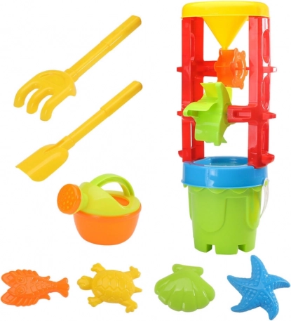 - Grande mulino per la sabbia, secchiello, paletta, rastrello, annaffiatoio, 4 formine