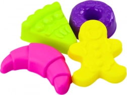 Quattro formine dai colori vivaci, a forma di donut, biscotto pan di zenzero e croissant, trasformano la sabbiera in una pasticceria piena di fantasia.
