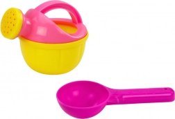 L’annaffiatoio colorato facilita l’umidificazione della sabbia e la paletta compatta si adatta perfettamente alla mano del bambino per scavare e trasportare.