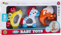 Questo set di giocattoli per neonati include tre adorabili sonagli a forma di volpe, zebra e granchio. Ogni sonaglio è progettato con colori vivaci che stimolano la vista e l'interesse del bambino. Contiene elementi sonori per lo sviluppo dell'udito e parti in gomma come morditori, ideali per il periodo della crescita dei dentini.