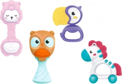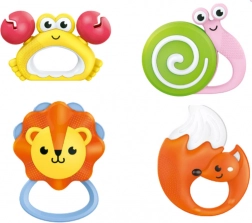 Questo set versatile di sonagli e massaggiagengive a forma di simpatici animaletti stimola la curiosità dei bambini e aiuta a sviluppare vista, udito e motricità fine. Colori vivaci attirano l’attenzione, elementi tintinnanti allenano la percezione uditiva e parti morbide da mordicchiare donano sollievo alle gengive durante la dentizione.