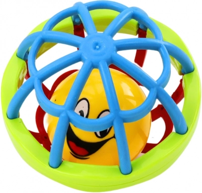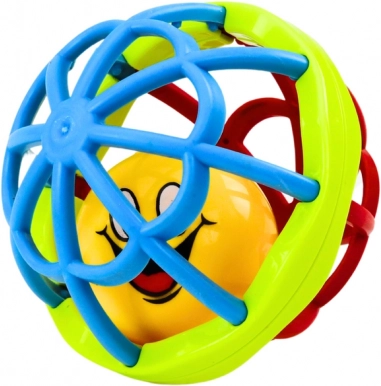 La struttura leggera e la forma ergonomica facilitano la presa e la manipolazione. Il sonaglio interno emette un suono lieve che stimola curiosità e interazione, mentre le superfici e i colori differenti favoriscono la stimolazione sensoriale e la motricità fine.