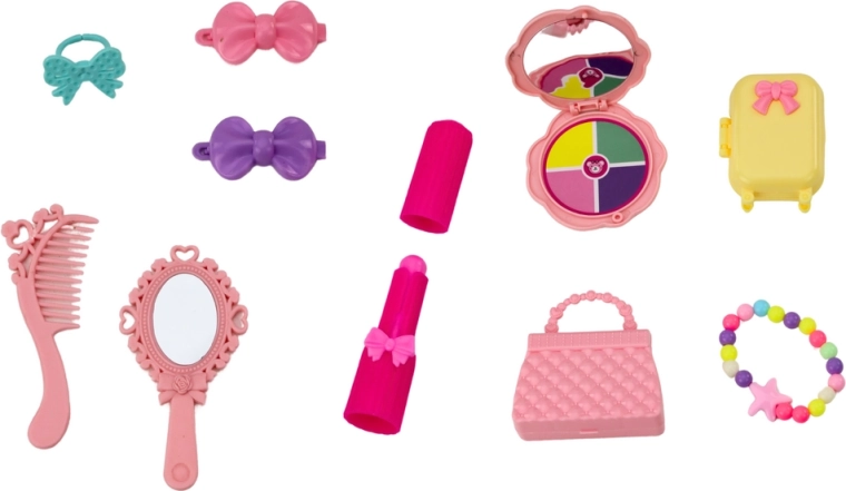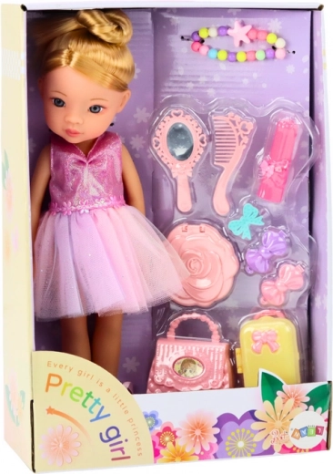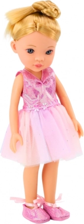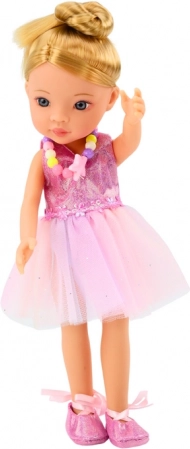 La bambola indossa un elegante abito da balletto rosa, scintillante e accattivante. Ai piedi ha classiche scarpette da ballo legate alla caviglia, che le donano l’aspetto autentico di una vera ballerina. La bambola ha lunghi capelli biondi raccolti in uno chignon alto, che sottolinea il suo stile da ballerina. Ha un trucco delicato e una collana colorata che le conferiscono charme ed eleganza. Inclusa una borsetta alla moda, ideale per i suoi piccoli accessori. Una valigetta funzionale che la bambola può portare nei suoi viaggi di balletto. Mollette per capelli per sistemare l’acconciatura della bambola. Un piccolo anello che aggiunge un tocco di eleganza. Specchietto, spazzola e specchio da mano per controllare il look prima dell’esibizione.
