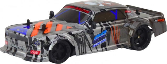 La carrozzeria grigia con accenti arancioni e grafiche da gara conferisce all’auto un aspetto autentico. Il profilo basso e le ruote larghe migliorano la stabilità alle alte velocità.