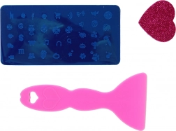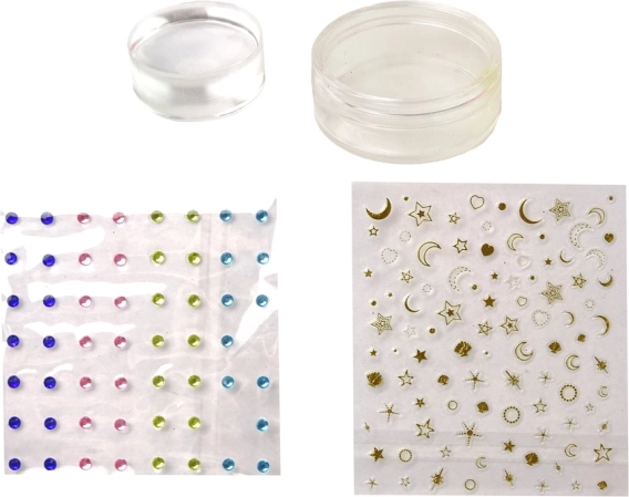 Piastrine, raschietto, timbro, adesivi e strass facilitano la creazione di motivi elaborati in pochi istanti: divertimento e ottimo risultato.