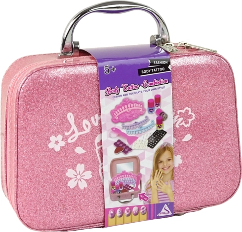 - Valigetta rosa glitterata con specchietto, 4 smalti colorati, separa-dita, lima, timbro, piastrina per timbri con motivi, raschietto/spatola, 3 sagome per tip, adesivi per tip, stickers e strass, piccolo contenitore