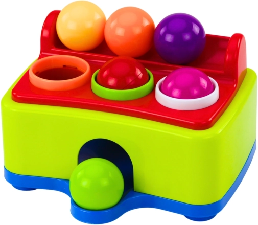 Sei palline colorate e le aperture sul tavolo invogliano i bambini a ripetere il gioco di battitura, che rafforza la presa, la precisione e la coordinazione.