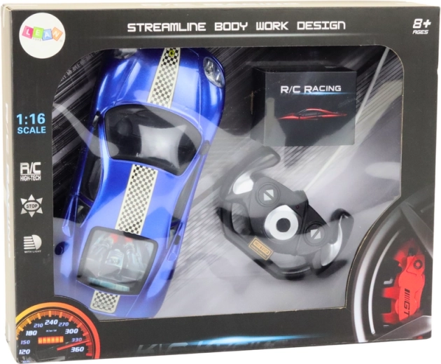 Presentiamo un'auto radiocomandata in scala 1:16 che si distingue non solo per il suo design unico, ma anche per le funzioni avanzate. L'auto colpisce per la carrozzeria laccata in un intenso colore blu che le conferisce un look moderno e stiloso. Un ulteriore elemento decorativo è l'evidente striscia bianco-nera sulla griglia del radiatore, che corre lungo tutta la vettura e le dona un tocco sportivo e dinamico.