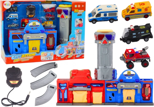 Stazione dei vigili del fuoco e della polizia City Action offre enormi possibilità di gioco con edifici di servizi di emergenza, microfono, luci e rampe per auto. I bambini possono allertare i veicoli di emergenza e coordinare le operazioni. Le auto possono scendere dalla rampa nel garage per aumentare la dinamica del gioco.