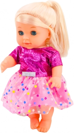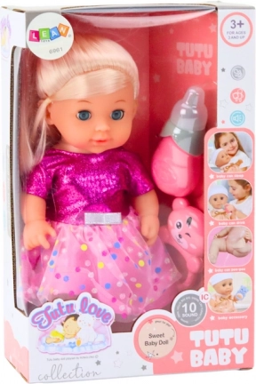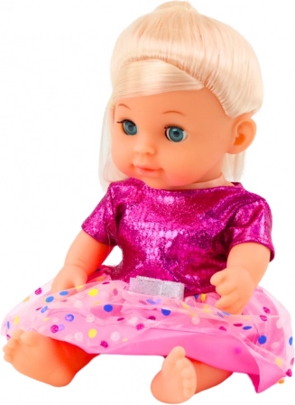 Una graziosa bambola con vestitino rosa a pois che farà felice ogni bambino. Offre un gioco realistico grazie alla funzione pipì dopo aver bevuto dal biberon, divertenti effetti sonori e arti mobili. Include anche un sonaglino per ancora più divertimento e per stimolare la fantasia.