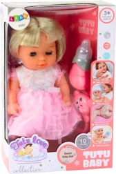 Sul pancino della bambola c'è un altoparlante che, quando si preme un pulsante, emette diversi suoni che possono imitare varie emozioni e comportamenti di un neonato. Questo stimola l'immaginazione dei bambini e aiuta a sviluppare le capacità uditive e cognitive.