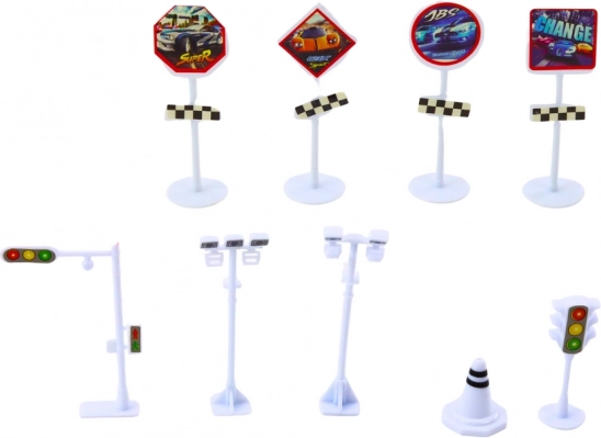 Nel pacchetto troverete anche un set di segnali stradali e un tappetino che simula un ambiente stradale, arricchendo il gioco.