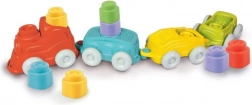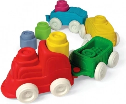 I morbidi blocchi colorati possono essere inseriti nella locomotiva e nei vagoni oppure impilati uno sull’altro per creare morbide torri colorate.