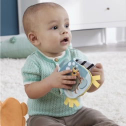 Il libricino in tessuto con colori a contrasto, dettagli fruscianti e specchietto sicuro favorisce lo sviluppo sensoriale, la concentrazione e la coordinazione mano–occhio. Le dimensioni compatte della lontra e del libricino li rendono ottimi compagni a casa e in viaggio.
