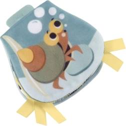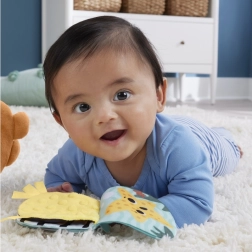 Posiziona il libricino con specchietto sulla schiena della lontra per incoraggiare il sollevamento della testolina, la messa a fuoco visiva e la coordinazione mano–occhio.