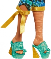 La bambola Cleo De Nile è pronta per l’evento musicale più hot dell’anno – il Monster Fest! Si distingue con un top dalle maniche dorate, pantaloni nei colori delle gemme e una corona con motivo di loto che valorizza i suoi lunghi capelli blu. Grazie alle articolazioni imposterai con facilità pose cool per foto e gioco narrativo.