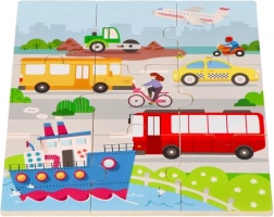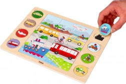 Grazie al legno robusto e ai bordi levigati, il gioco è sicuro dai 18 mesi. Colori vivaci e forme chiare attirano l’attenzione e aiutano a conoscere meglio auto, autobus, barche, aerei e altri mezzi di trasporto. Una volta terminato, il bambino può nominare i veicoli e cercarli nell’immagine grande: un’ottima attività per lo sviluppo del linguaggio.