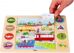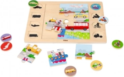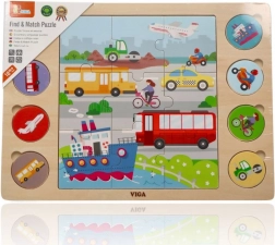 Il set di puzzle in legno VIGA “Trova e abbina – mezzi di trasporto” unisce il piacere del gioco a un apprendimento intelligente. Al centro si compongono 9 grandi pezzi per formare l’immagine, poi il bambino abbina 8 gettoni rotondi con i veicoli alle loro sagome sulla tavola. Favorisce l’apprendimento naturale attraverso il gioco e rafforza l’autostima del bambino a ogni abbinamento riuscito.