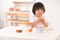Questo set per la colazione in legno, curato nei dettagli, è ideale per le prime avventure in cucina. I bambini preparano la propria colazione – dal taglio del pane alla spremitura del succo fresco. I dettagli realistici e le piacevoli tonalità pastello invogliano al gioco e stimolano la fantasia.