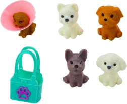 Cuccioli di vari colori e borsa colorata con motivo a zampa, ideale per trasportare e giochi immaginativi.