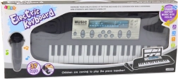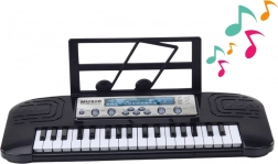Pianino elettrico per bambini in elegante colore nero con 37 tasti, microfono e leggio offre ore di divertimento e apprendimento. Supporta lo sviluppo musicale, la creatività e la sicurezza nelle esibizioni grazie alle funzioni che imitano pianoforte, chitarra, carillon e violino.