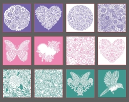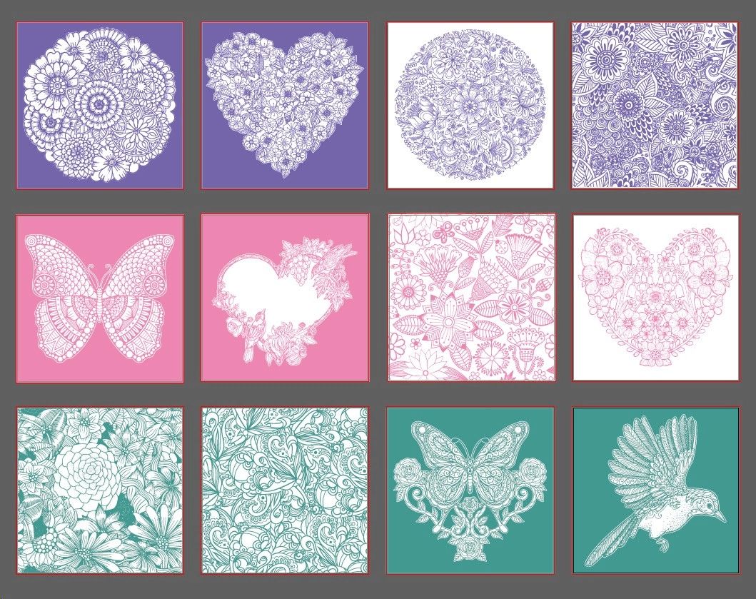 Il set include 12 immagini da colorare con motivi di animali e piante. Le immagini presentano una lamina metallica nei colori rosa, viola e verde. Spessore della carta: 170 g. Per colorare si possono usare matite colorate o pennarelli.