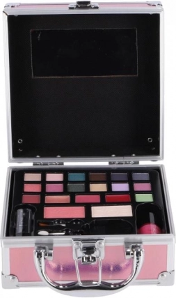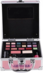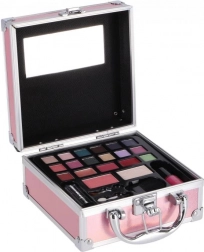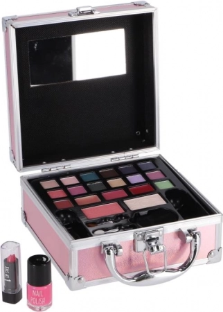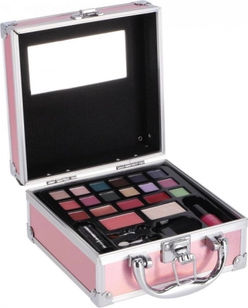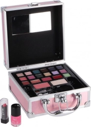 Elegante mini valigetta rosa per il trucco, ideale per l'uso quotidiano e in viaggio. Contiene tutto il necessario per un make-up rapido: 14 ombretti, colori labbra glitterati, blush e cipria, rossetto e smalto. Il pratico specchietto, il pennello per blush, l'applicatore a spugnetta e il pennello per labbra assicurano un'applicazione comoda a casa e in viaggio.