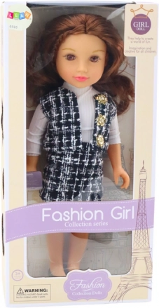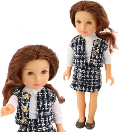 La bambola vanta un abbigliamento elegante composto da una gonna a quadri bianca e nera e un gilet che insieme creano uno stile unico. Una camicia bianca a maniche lunghe completa il look classico.