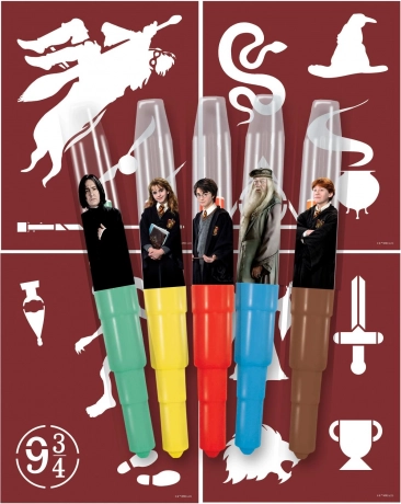 Crea le tue immagini magiche con i pennarelli a soffio ispirati al mondo di Harry Potter. Il set include 6 pennarelli a soffio colorati e stencil con motivi iconici: le case di Hogwarts, i Doni della Morte, il Boccino d’Oro e gli occhiali con la cicatrice. Inserisci il pennarello nel supporto, soffia e ottieni in un attimo un effetto spray.