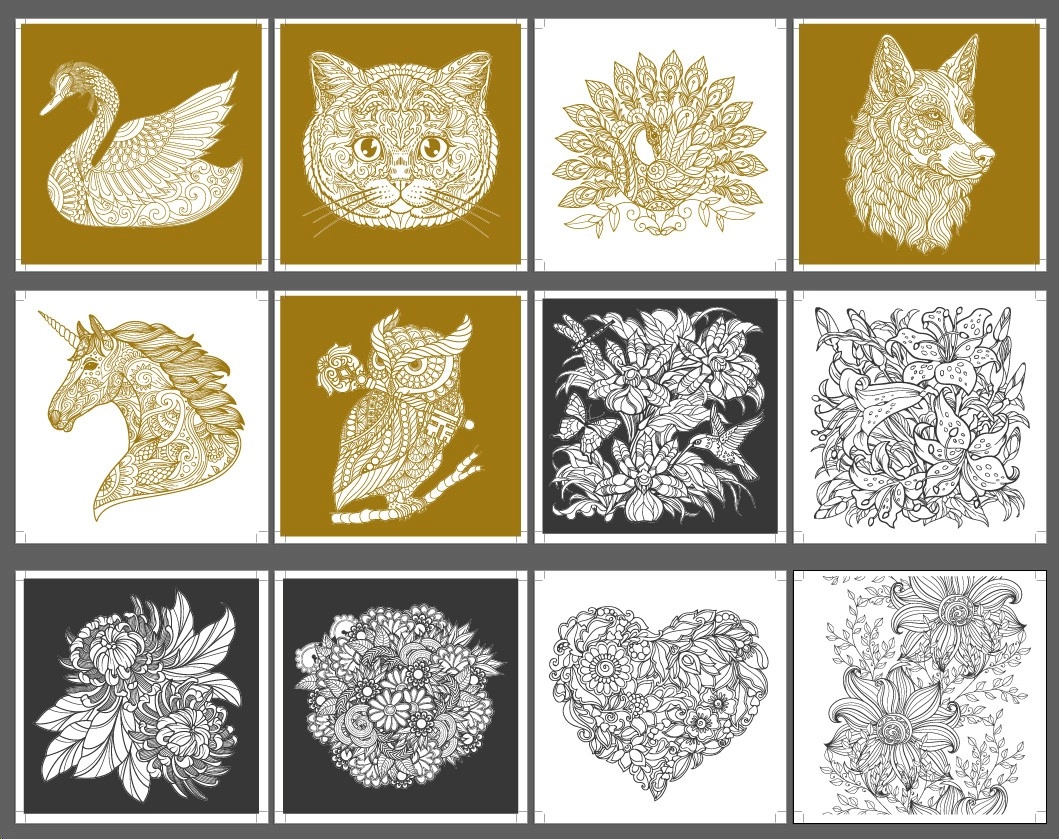Questo elegante set di pagine da colorare piacerà a bambini e adulti. La brillantezza metallica della lamina dorata e argentata dona a ogni motivo un aspetto lussuoso ed esalta le tue creazioni colorate. I disegni con motivi di animali e piante favoriscono creatività, relax e motricità fine.