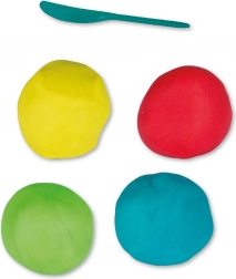 L'immagine mostra quattro sfere di plastilina colorate - giallo, rosso, verde e turchese. Un giocattolo creativo per modellare e plasmare in diverse forme.