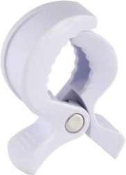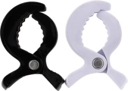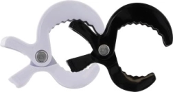 Pratici clip in plastica per passeggino in colore bianco‑nero per fissare in modo facile e sicuro gli accessori. Ideali per pannolini, asciugamani, reti anti‑insetto e altri tessuti. La confezione contiene 2 pezzi con presa salda e cerniera metallica resistente per l’uso quotidiano.