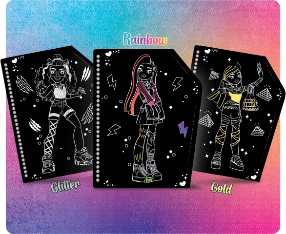 Scopri un modo divertente di disegnare e decorare con l’album da graffiare Monster High. Basta grattare leggermente la superficie nera per svelare fantastici effetti di colore che donano alle tue creazioni uno stile unico.