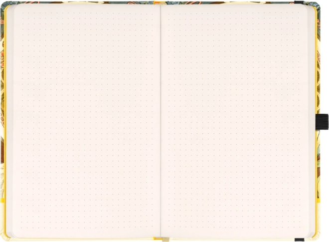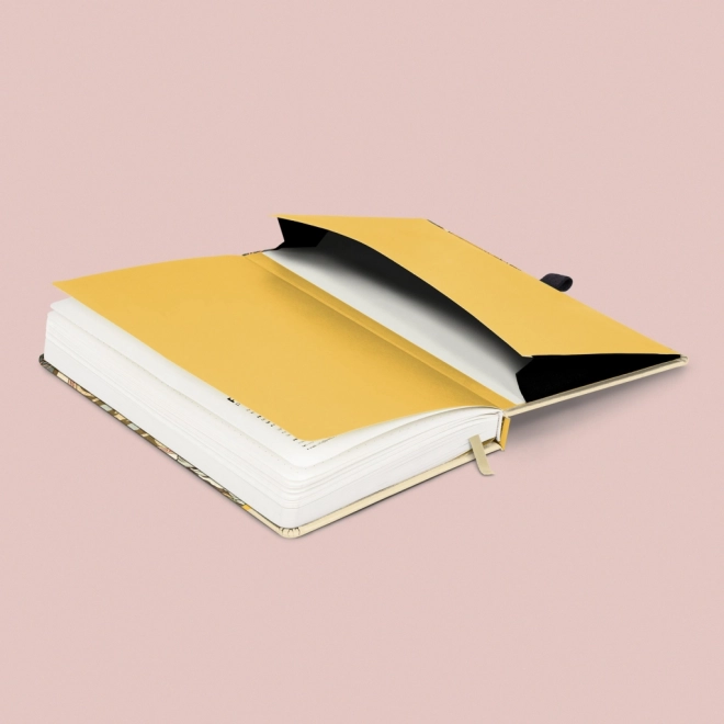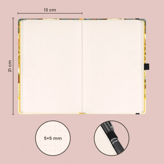 Elegante quaderno con il motivo dell’opera di Alfons Mucha con copertina rigida, offre 172 pagine puntinate su carta giallina, chiusura elastica, tasca interna per piccoli oggetti e passante per penna – ideale per appunti, pianificazione e schizzi creativi.