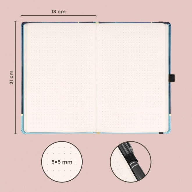Elegante quadernino con il motivo dell’opera Alfons Mucha – Luna con copertina rigida. Offre un layout puntinato per appunti creativi, chiusura con elastico, tasca per piccoli oggetti e passante per penna. All’interno ci sono 172 pagine in carta gialla piacevole al tatto, nel formato 13 × 21 cm – ideale per planning, bullet journal e schizzi.